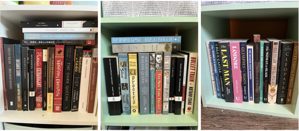 As a related segue, and to answer a friend’s suggestion (hi Lee!), here’s my current shelf of books to read. Or at least, it was as of a couple months ago (when I decided to move most of my unread books into my bedroom, where I do most of my reading, and move all my already-read books down into our “library” (the dining room)); now I’ve read about 10 or so of these (there’s also a couple “hey I haven’t read that in 10-15 years, I should give it another go”). I keep saying that I can’t buy any more books until I’ve read all of these, but let’s be honest: that simply is not going to happen, because I do not have that kind of self-control.