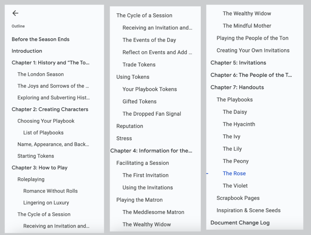 This one has been rewritten several times in the last 4.5 years because I keep scrapping it and starting over. I’m feeling good about it this time though, confident about what I want from it in a way I wasn’t before. Just over the last few years, I’ve learned so much more about both my own working process and also what I want from my work, you know? For example, I’ve learned that it works best for me if I outline the table of contents of the game first, and then tackle sections as they come together for me, rather than trying to work through the whole book from intro to conclusion in order. This is what that outline looks like for BTSE!