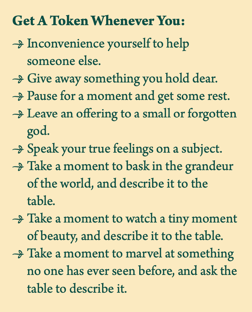 Meanwhile, in Wanderhome, there’s certain acts for which you receive a token, and those tokens can then be spent as a narrative currency to do other acts. These are explicitly rewarded behaviors, so again, while each one may not be appropriate for every moment or for every character, they are things that we all understand are on the table as “good behavior” in this social situation. If another player says, “And as I look up at the sky through the canopy of giant daisy petals, the sunlight is filtered through pink and orange and yellow, all dappled and warm,” I will understand that there is a moment of beauty here that we’re enjoying.