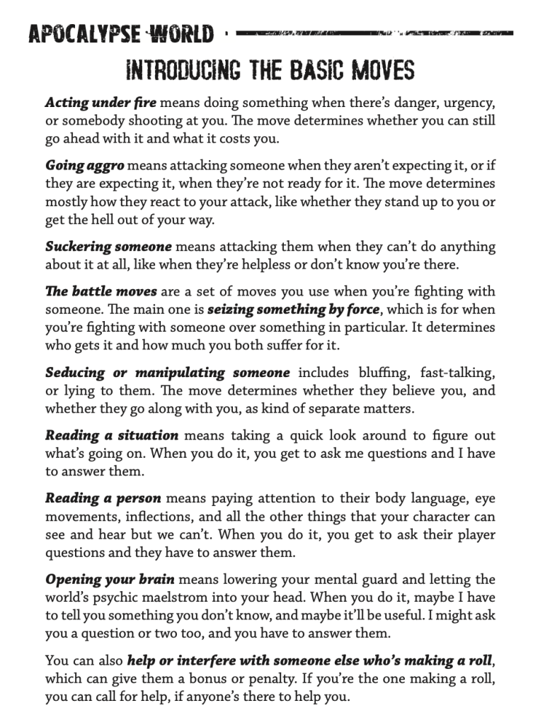 In more specific situations, things that aren’t covered by your etiquette 101, your pleases and thank yous, the games’ mechanics step in to tell you how it’s appropriate and expected for you to behave. Apocalypse World does this with its basic moves. You don’t HAVE to do any given basic move, and not every move will be applicable to every situation, but within the scope of play, you should expect situations to arise where these ARE the appropriate responses and where you SHOULD feel encouraged to do them. You won’t always want to “go aggro” or “seduce or manipulate someone”, but everyone should expect those to be on the table as acceptable and encouraged modes of engagement. I don’t have to accept the man asking me to dance, but I also shouldn’t be weirded-out and out-of-sorts that a man is asking women to dance at a ball. I knew that was on the table and accepted that by coming to the ball in the first place, even if I personally came to play bridge with the old spinsters.